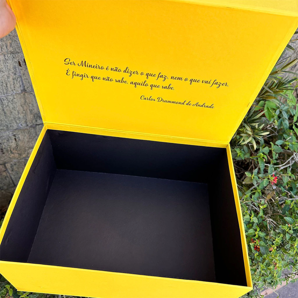 Uma caixa amarela sofisticada, que se fecha com imã trazendo praticidade e elegância.