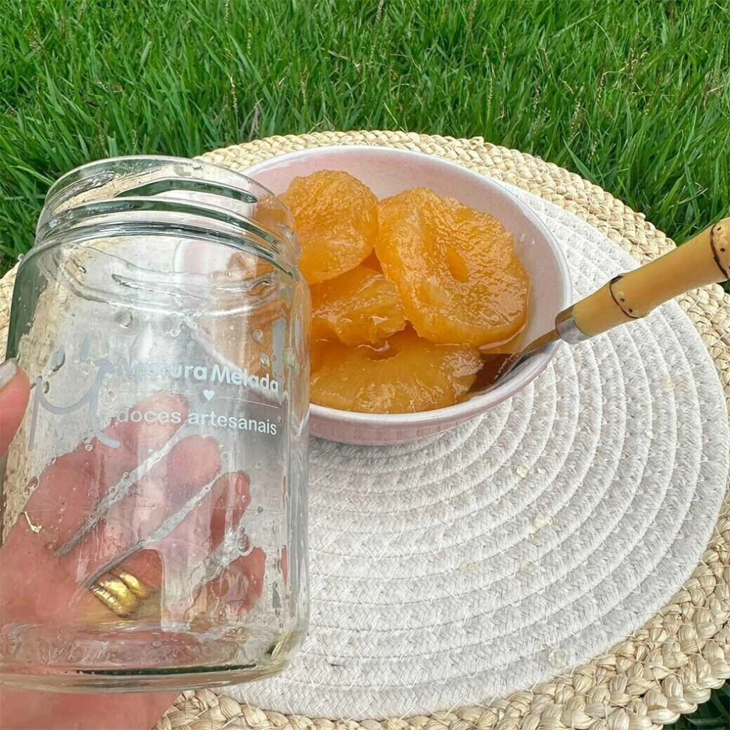 A Compota de Abacaxi Mistura Melada é uma verdadeira lembrança de infância para os amantes de frutas. Feita artesanalmente e manualmente com uma seleção especial de frutas e um toque melado, essa compota é perfeita para qualquer ocasião. Sem corantes ou conservantes, ela realça um sabor autêntico das frutas, lembrando a casa de vó. Produzida com todo capricho e cuidado em Carmo do Rio Claro - MG, é ideal para acompanhar torradas, queijos ou até mesmo para dar um toque especial nas sobremesas.